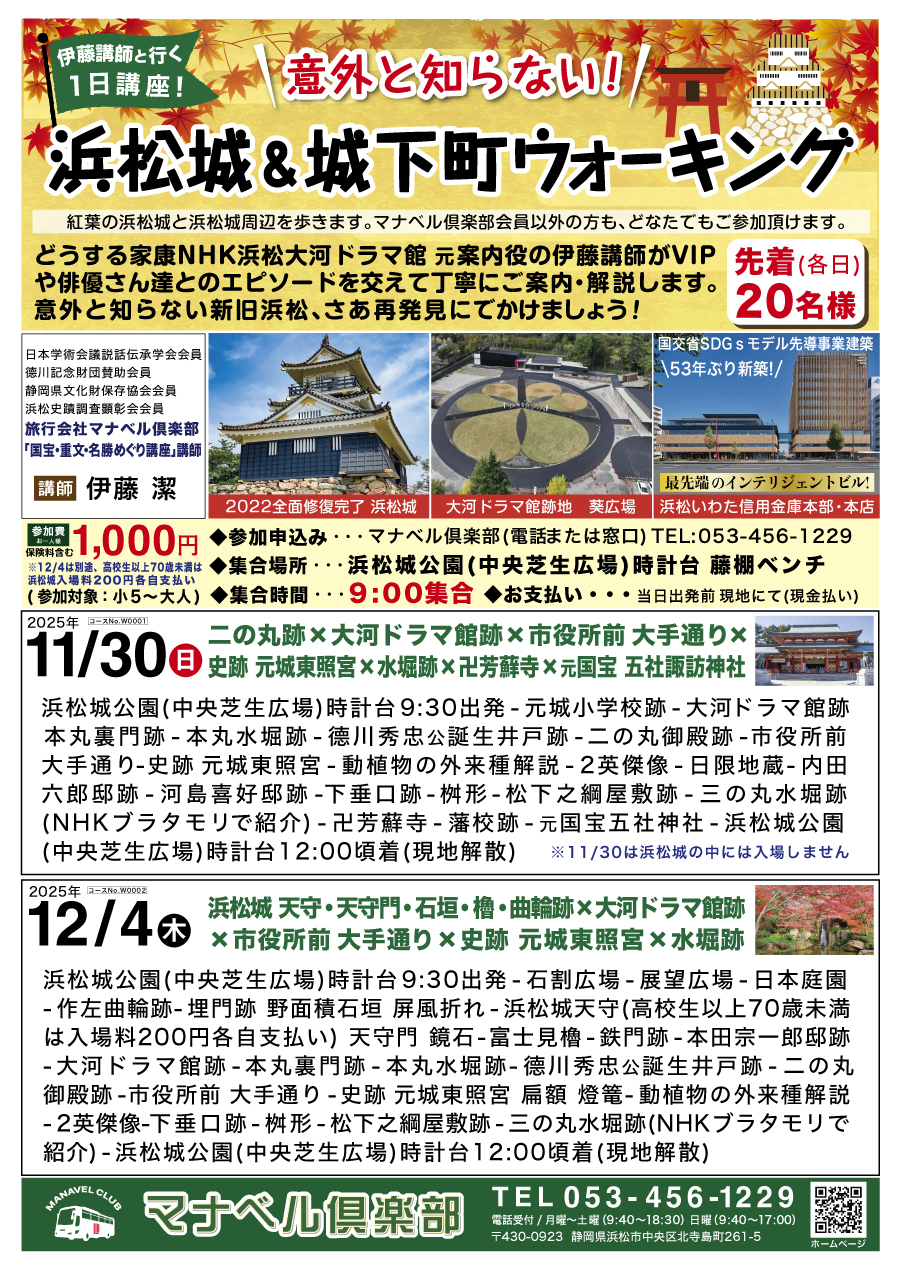 どうする家康NHK浜松大河ドラマ館 元案内役の伊藤潔 講師がVIPや俳優さん達とのエピソードを交えて丁寧にご案内・解説します。意外と知らない新旧浜松、さあ再発見に出かけましょう!