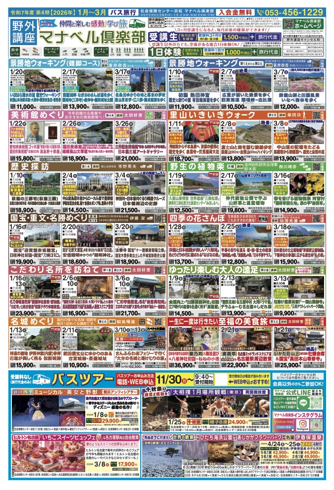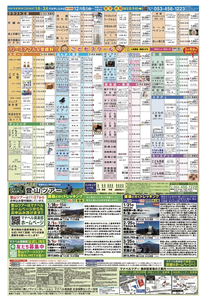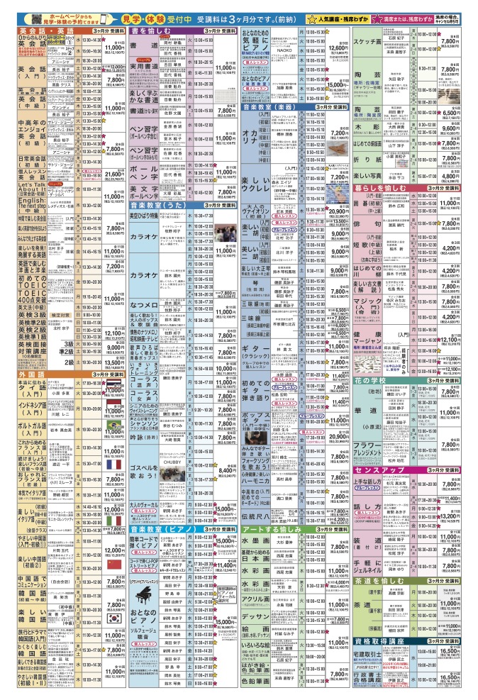 とってもリーズナブルな受講料♪受講料は3ヶ月分の料金です。(1ヶ月分ではありません!)チラシ画像をタップするとPDFにてご覧いただけます。11/30(日)に新聞折込チラシが入ります。また、ご希望の方へチラシの郵送も致します(資料請求のページよりご請求を)。講座の見学・体験受付中です!新しいこと、始めてみませんか? 定員になり次第締め切りとなりますので、気になる講座はお早めに!※1日講座のみWEB申込みもできます。↓タップで拡大表示(PDF)↓