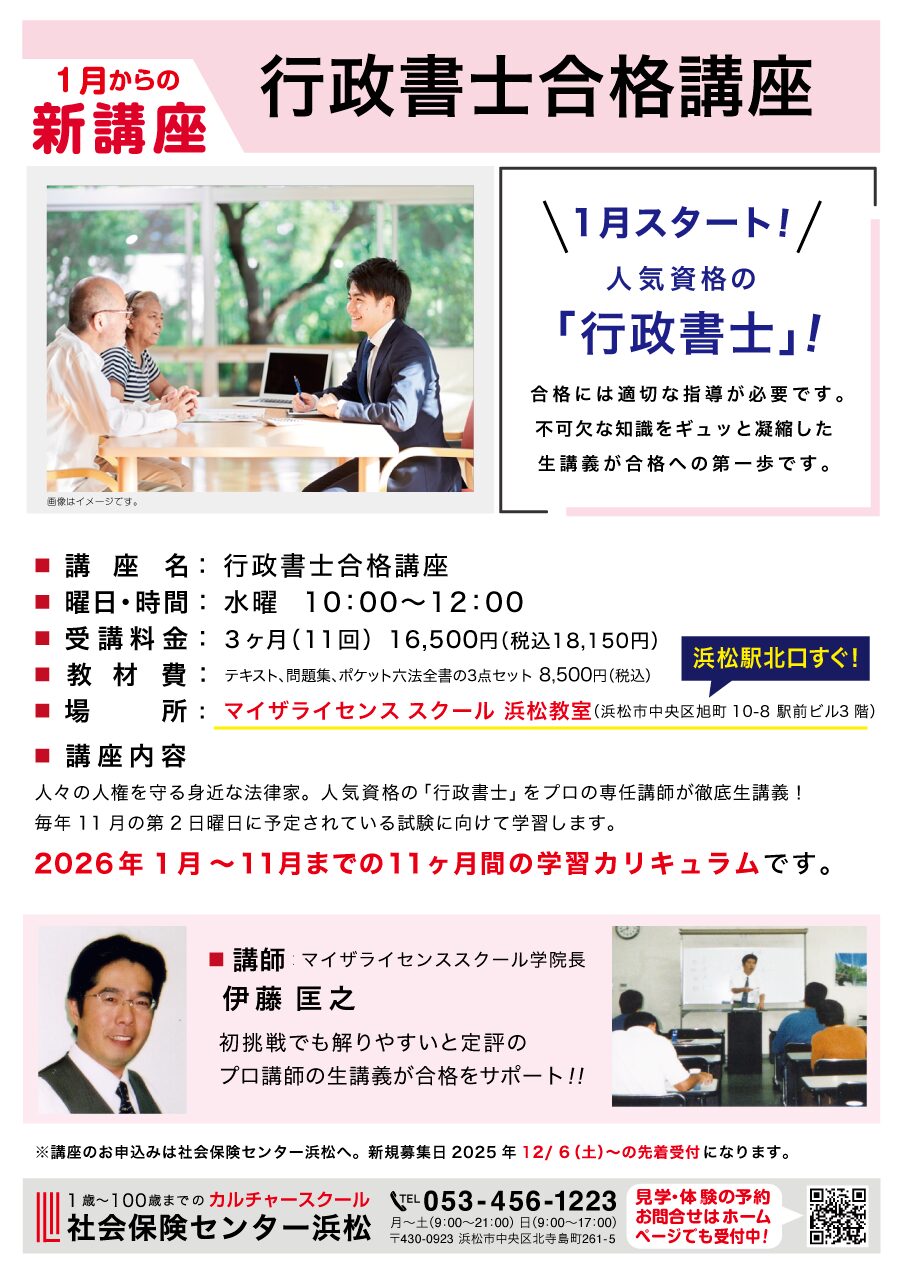 毎年1月スタート!人々の人権を守る身近な法律家。人気資格の「行政書士」をプロの専任講師が徹底生講義!毎年11月の第2日曜日に予定されている試験に向けて学習します。合格には適切な指導が必要です。不可欠な知識をギュッと凝縮した 生講義が合格への第一歩です。初挑戦でも解りやすいと定評のプロ講師の生講義が合格をサポート!!