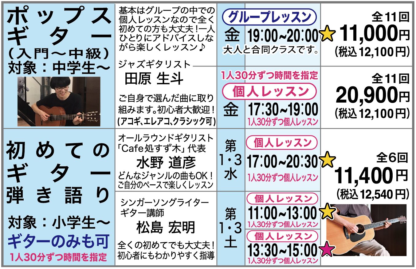 ・レベル:入門~中級・対象:中学生〜大人・ギター:アコースティック、エレアコ、クラシック■ グループレッスン (中学生〜大人まで合同クラス)一人ひとり...